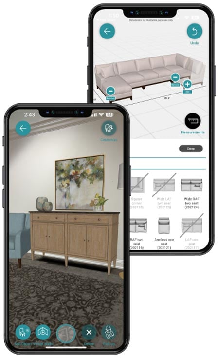 Shopping in the app has all the bells and whistles, from fabric, leather, and finish options to decorating tools that allow you to change up your walls. You can even configure custom products and connect with a designer without ever leaving the app.