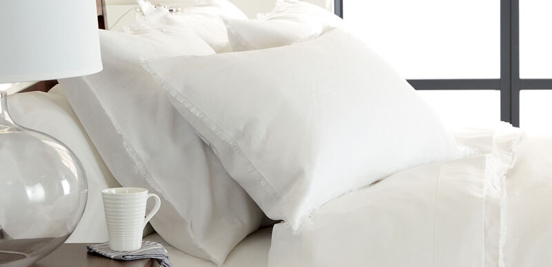 - Crisp white linen/cotton sham features a small frayed fringe around edges. Envelope closure at back.