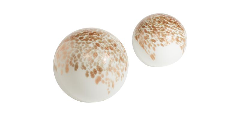 Our milky white Speckled Glass spheres, featuring a cascade of gold confetti along their surfaces, add immediate elegance and celebratory vibes wherever they're placed. These spheres look especially festive on a holiday tabletop.