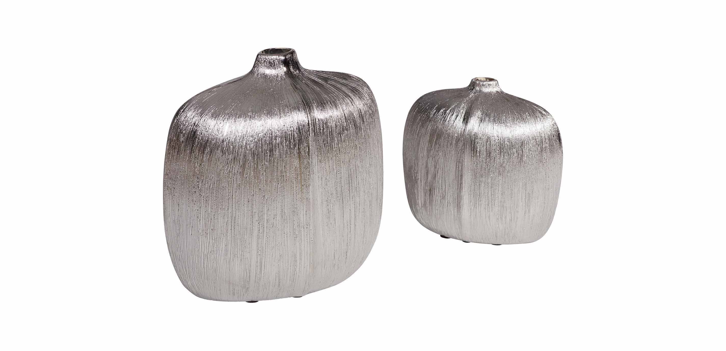 - Textured vases with a simple, sophisticated silhouette and a unique silvery metallic finish