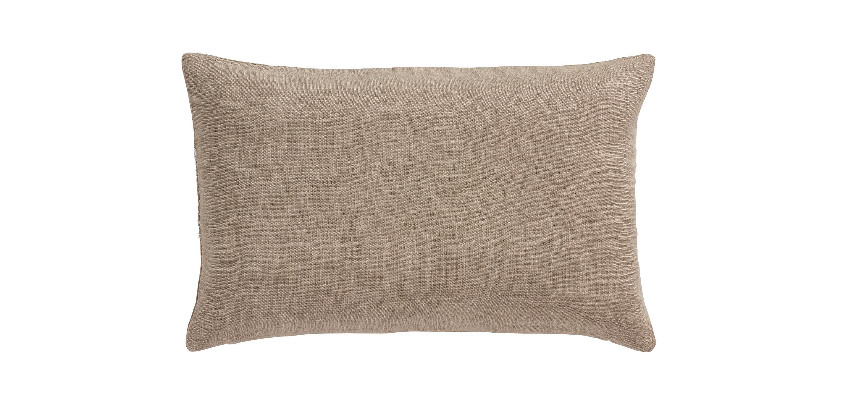 - A band of rich embroidery stretches across the face of this 100% woven linen lumbar pillow. Measures 14" x 22" and reverses to a solid linen back.