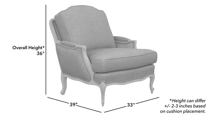 • Our Versailles chair features a loose, double-welted back and seat cushion and a carved wooden frame
