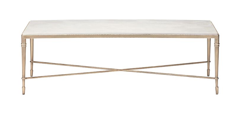 - Mixed-material rectangular coffee table. Polished white agate top with hand-cast metal stretcher base.