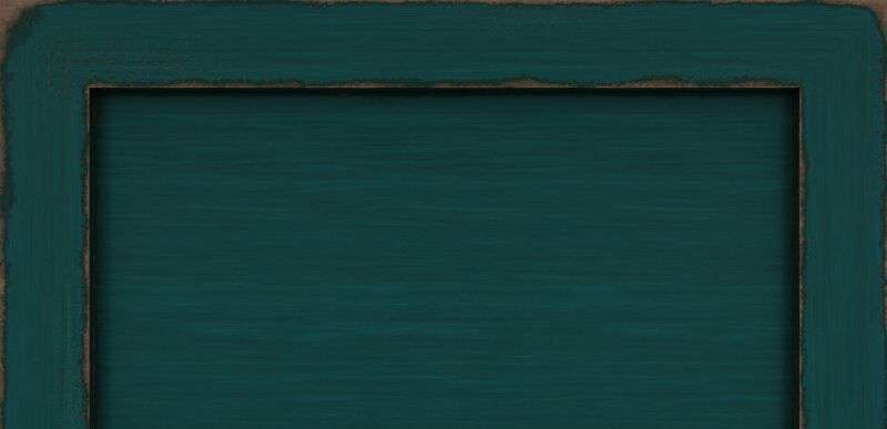 - Teal paint, highly worn edges show stained wood below, overall glazing, high sheen.