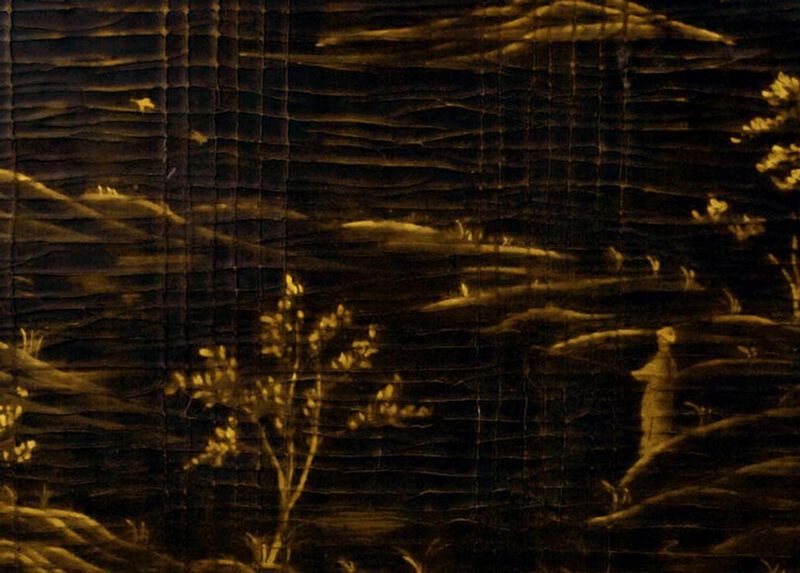 - Lacquered with gesso glaze, gold-painted accents, and hand-painted traditional Chinese landscape designs.