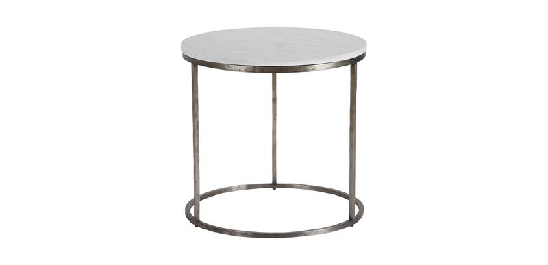 - A round marble-top pullup table, crafted with a base of textured steel and a top of Carrara marble for a relaxed, modern vibe