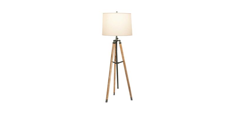 Architectural form with metropolitan attitude. The Surveyor's floor lamp is packed with style and function; inspired by vintage tripod instruments, the antique bronze finished steel and natural wood base makes a modern statement with an oversized, eggshell paper drum shade as the perfect topper.