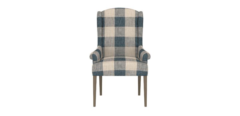 - Upholstered wingback dining host chair. Tight back; scroll arms.