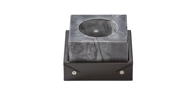 - Marble catch-all cube seated in a hand-stitched leather tray