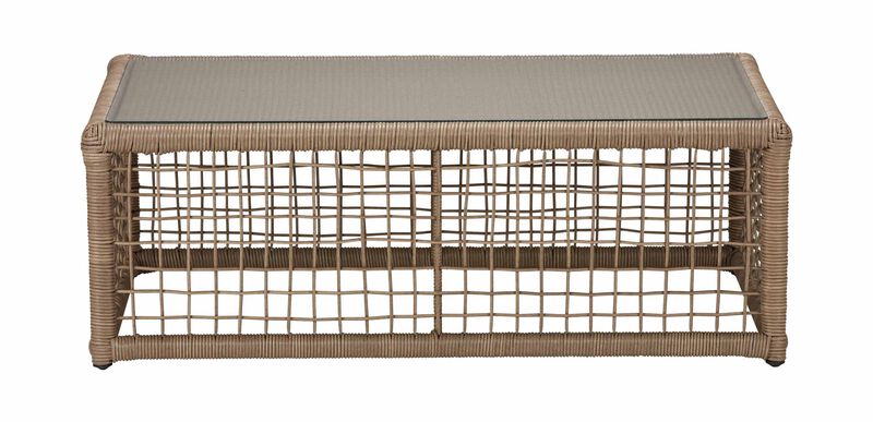 Inspired by woven island hammocks and sunny afternoons. Features a sturdy aluminum frame wrapped in durable all-weather wicker, with a tempered glass top.