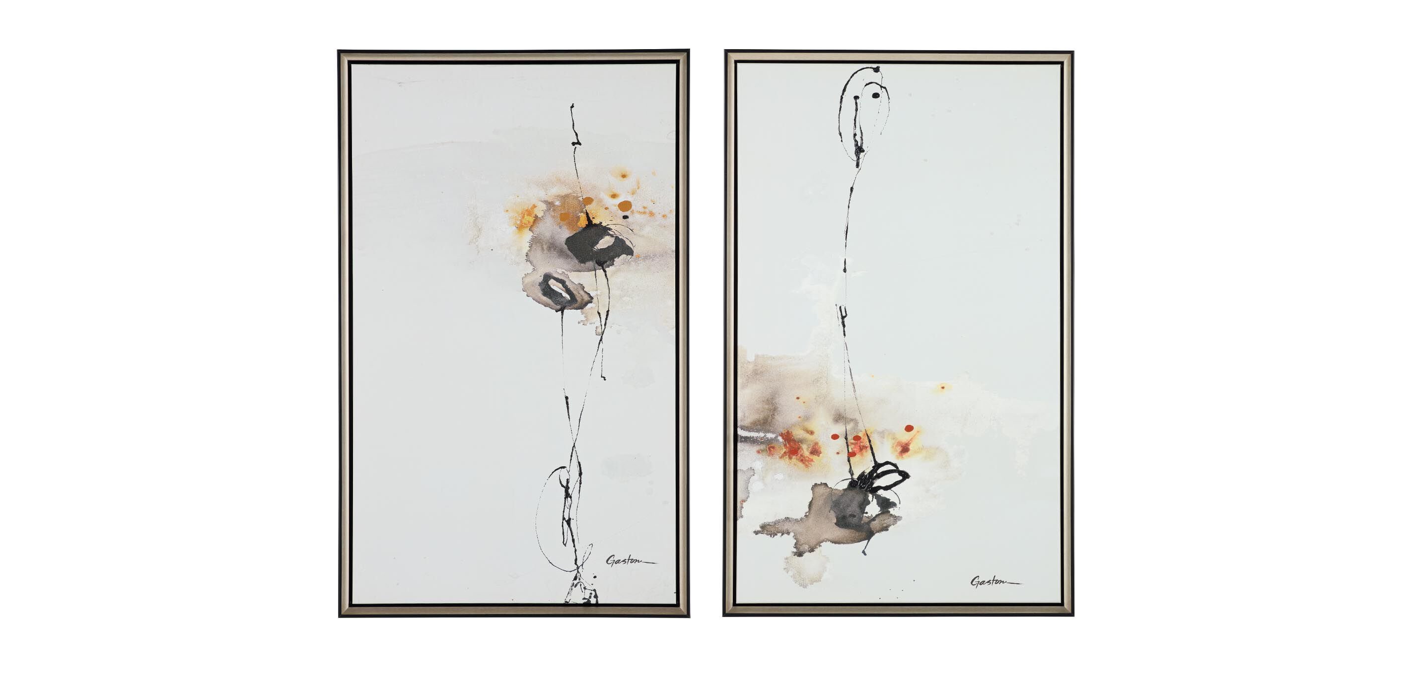 Inky watercolors—with touches of crimson and gold—float up and down an ivory canvas in Spatial Floating, a beautiful abstract art print perfect for calm, modern rooms.