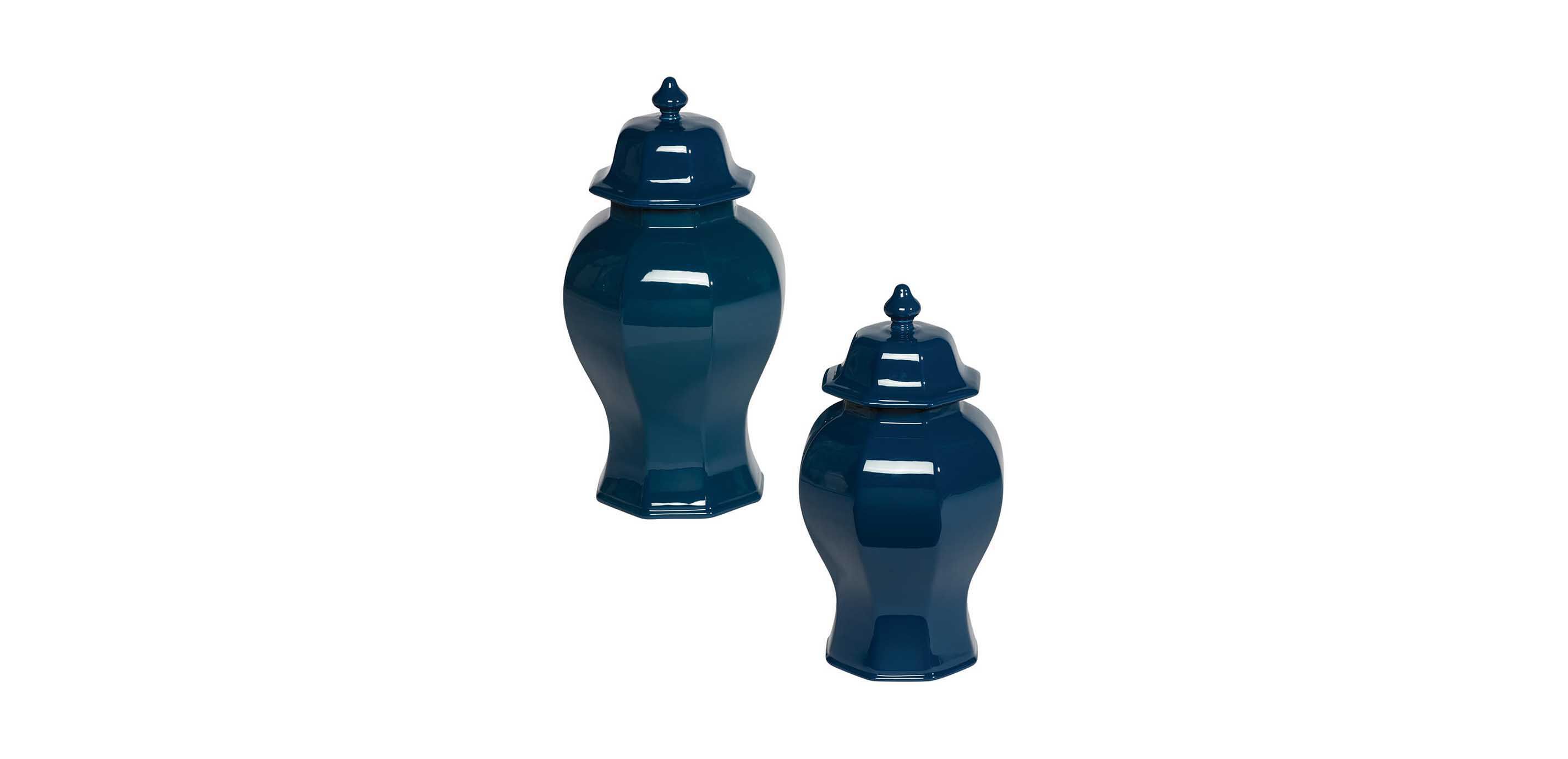 Decorative temple jars are a mainstay of chinoiserie décor, but this is a traditional ceramic jar with a difference. Its high shoulders, small mouth, and domed lid are true in form to the original ginger jar, but it’s uniquely geometric, giving it a more eclectic (even modern) feel. Artisans use a time-honored technique to apply the glaze, which is smooth and glossy—and enchanting.