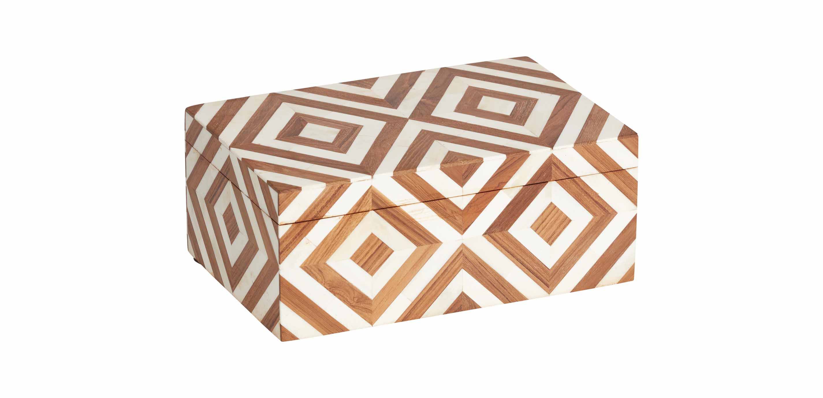We thought in the box for functionality and out of the box for fabulous exterior design. Crafted from teak wood and polished bone arranged by hand in a striking geometric pattern, with a shellac-like interior finish. Makes a stunning yet practical gift; even better in pairs.
