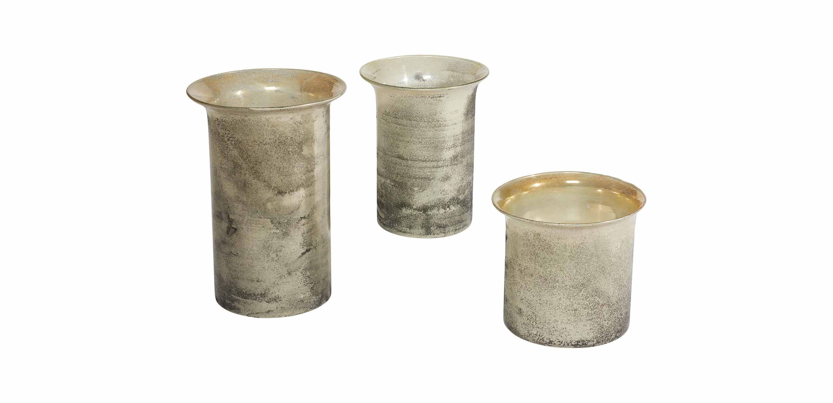 Mercury glass, one of the first art glass types, gets a loving tribute in the form of Chantilly. Artisans create the cylindrical shape from mouth-blown glass, carefully bending the top to create its signature flare. Then, they paint each piece by hand in silver to imitate the look of mercury glass, fire it, and lacquer it to seal in its luster.