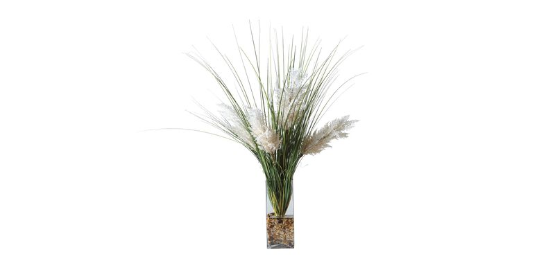 Flora by Ethan Allen—The basics of beautiful floral design—sprays of lively green grasses and frothy white plumes give texture as well as color to any interior landscape. Our Pampas Grass in a Glass Vase is a faux-bulous example of how simple is naturally stylish.