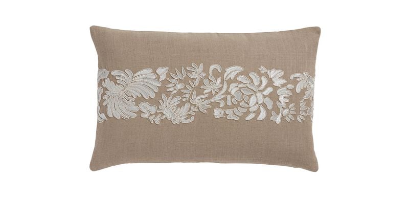 A sweet addition to any classic room. Our Natural Linen lumbar pillow features a band of damask-inspired embroidery across its front.