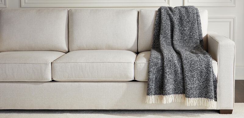 A bouclé throw blanket in heathered black alpaca is always a cozy idea. Ours is made using responsibly sourced alpaca yarn, so you can curl up knowing your blanket is the best of the best. Cream-colored tassels add an extra pinch of casual comfort.