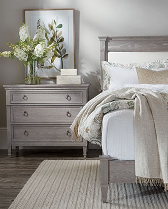 If you’re creating your own bedroom set, and you aren’t sure whether your pieces will go together, use our Designer Chat button to ask a designer. You can also order some free finish samples so you can see whether the finishes complement one another. It’s really easy to drop into a Design Center and spend some time chatting with one of our interior designers, or you can set up a home visit, where they can look at your space, take measurements, and get a sense of what changes you want to make.