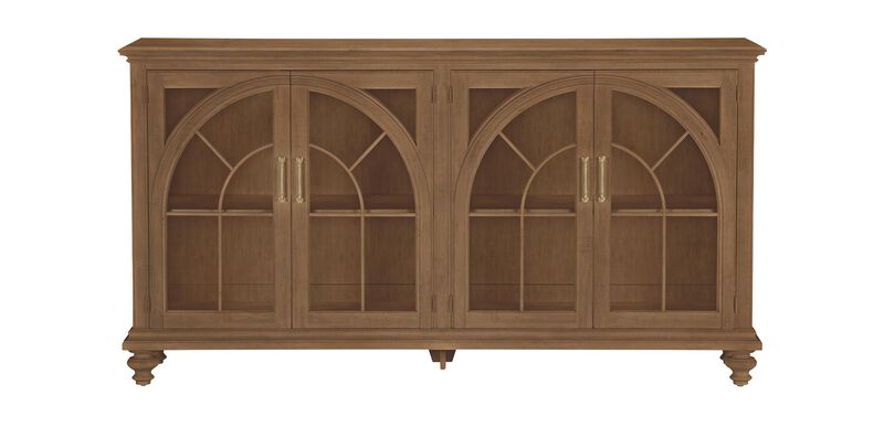 Inspired by vintage window shapes found at the peaks of cottages, our Zeta buffet cabinet features bun feet and inset carving at the pilasters—a vintage-inspired update. Layers of molding create the curved overlays found on each door. Stunning arches highlight the cabinet's doors, while tempered glass door panels show off dishes or collectibles.