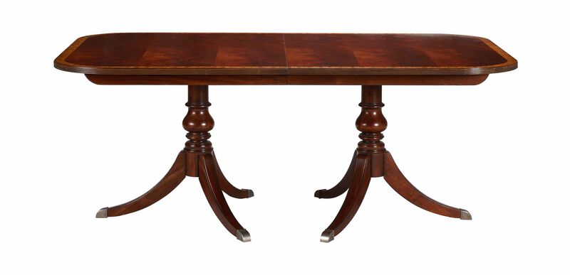 Abbott weaves modern livability into classic Sheraton styling. Unique pedestals rest on handsome sabre legs; an ornate top sets the scene for fine dining.