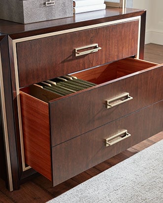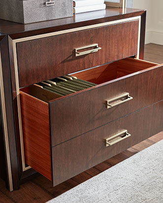 • Home office storage: If you need more room for files, books, and supplies, invest in chests or cabinets. Want to display décor, mementos, and awards? Look for open bookcases.