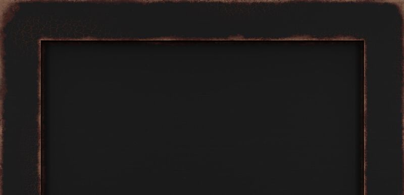 - Black paint, highly worn edges show stained wood below, overall glazing, high sheen.
