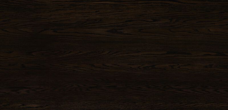 - Cool dark brown stain with black undertones, lightly distressed, satin sheen.