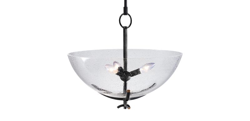 Suspend it from the ceiling or hang it semi-flush in snug spaces. Our Ronan chandelier features seeded glass that rests on a black iron frame, highlighted with antique brass.