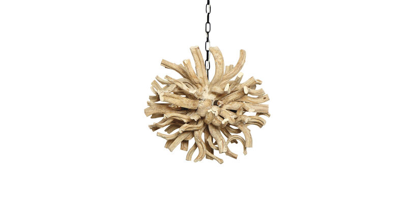 Handcrafted for us in Thailand, this chandelier's design was inspired by Asia’s abundance of unique and naturally shaped vines, roots, tree trunks, and branches. The wood has been washed, sanded, and treated to reveal the beautiful texture underneath. With skill and craftsmanship, an artisan assembles the pieces to create a chandelier that's one of a kind.