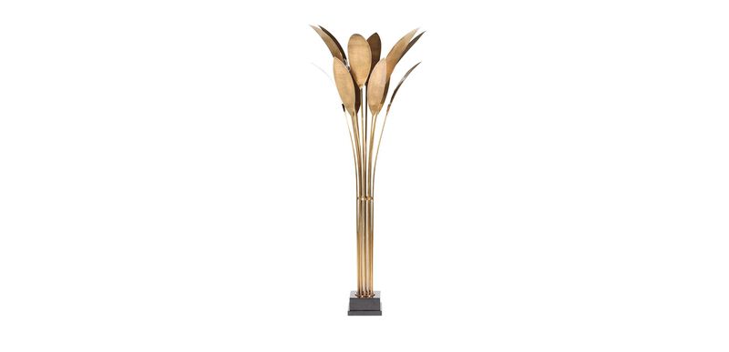 - A dramatic torchiere floor lamp with hammered, brass-toned palm leaves emerging from a black granite base