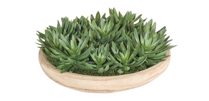 - A faux succulent arrangement in a natural wood bowl