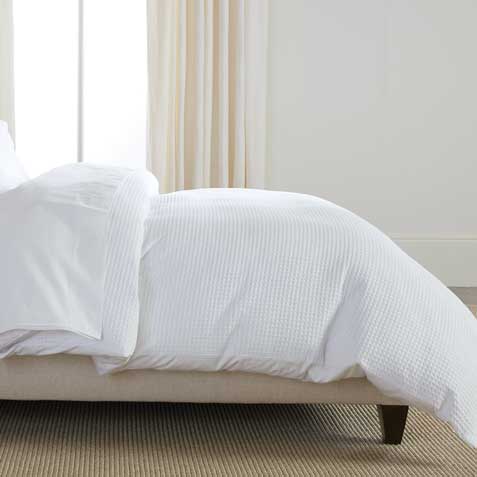 - Lightweight, textured waffle weave in soft white; reverses to a crisp percale back.